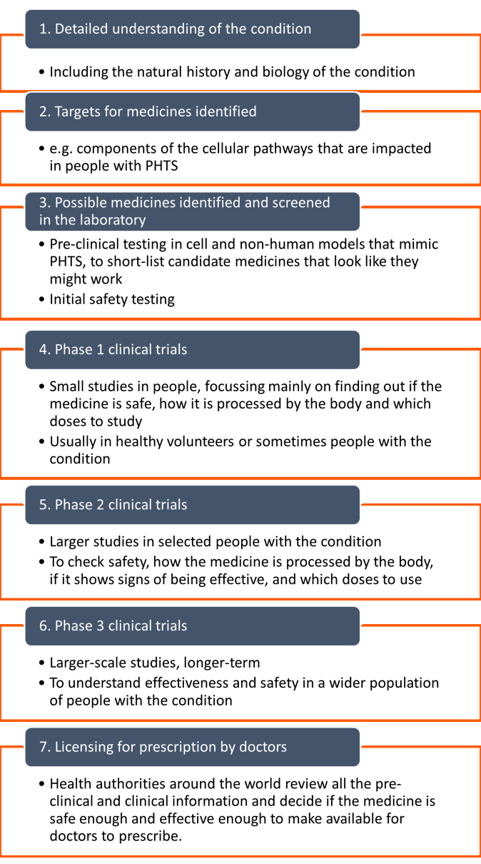Developing new medicines is a long and complicated process. It starts with research designed to understand exactly what causes the condition, so that medicines to target the cause can be identified. It finishes with large scale clinical trials in people with the condition to show that a potential new medicine is effective and safe enough to be prescribed by doctors.